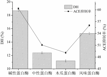 將上述的四種蛋白酶在各自的**適酶解條件下對核桃蛋白進行酶解,以ACE抑制率和水解度為指標,選出制備核桃降壓肽的**適用酶,結果見圖2: