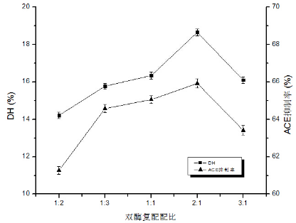試驗結果如圖3-2所示,酶添加總量保持不變,堿性蛋白酶和風味蛋白酶按一定的比例添加,由試驗結果圖看出,隨著堿性蛋白酶與風味蛋白酶復配比例的減小,水解度呈先快速增大后緩慢減小的趨勢,從復配比例3:1到2:1的過程中增幅較大,雙酶復配配比為2:1時水解效果明顯強于3:1;二者添加量比例繼續減小,風味蛋白酶的相對添加量不斷增大,水解度和ACE抑制率呈現下降趨勢。因為水解度盡可能大的情況下,酶解液中的肽含量增加,降壓活性肽含量也相應增加,故ACE抑制率增大,反之亦然。選擇**適宜的堿性蛋白酶與風味蛋白酶添加量比例為2:1。