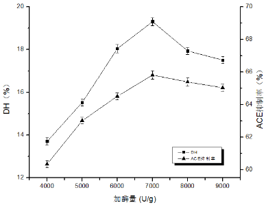 由圖3-3可知,隨著加酶量的增大,酶解液的ACE抑制率和水解度增大,在加酶量為7000U/g時ACE抑制率達到**大值,原因可能是隨著酶濃度的增加,有利于酶與底物的結合,對酶解有促進的作用。隨著加酶量的繼續增大,酶解液的ACE抑制率和水解度略有降低,原因可能是一部分具有ACE抑制活性的多肽被進一步水解成不具有降壓活性的小肽。故選擇7000U/g為**適加酶量。