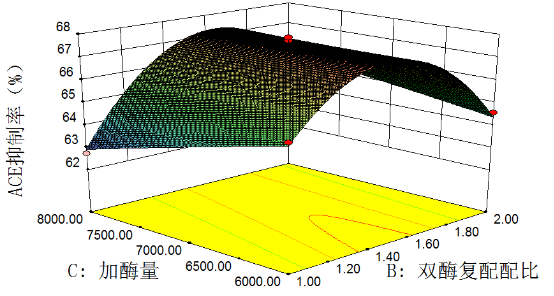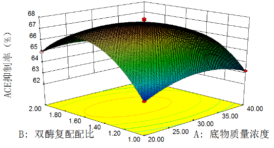 利用Design-Expert 8.0軟件進行工藝參數的優化組合,得到堿性蛋白酶-風味蛋白酶分步酶解核桃蛋白制備ACE抑制肽的**佳工藝為:底物質量濃度28.80g/L、加酶量6000U/g、雙酶復配配比3:2,ACE抑制率可達到67.7217%。根據實驗室條件調整酶解工藝為底物質量濃度29g/L、加酶量6000U/g、雙酶復配配比3:2,得到的實際抑制率67.05%。