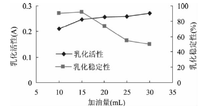 圖2 加油量對鷹嘴豆分離蛋白乳化活性及乳化穩定性的影響