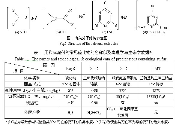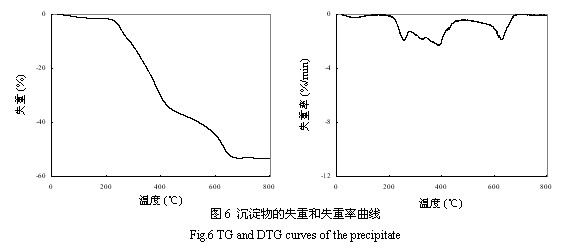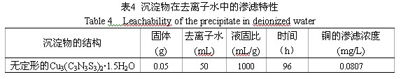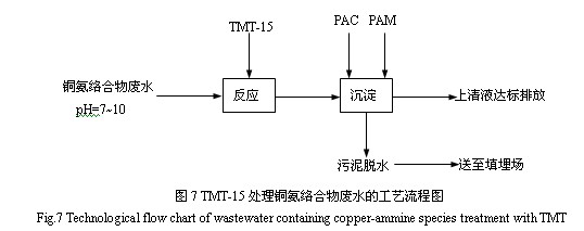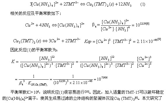 含銅廢水主要來自印刷電路板、金屬的漂洗和電鍍、紙漿制作等行業[1]。過量的銅會產生危害并有致突變作用[2],用含銅廢水灌溉農田,銅可在土壤和農作物內累積,產生危害[3]。為了控制銅等重金屬對水體的污染,保護地面水和地下水水質的良好狀態,我G政府制定了統一的污水排放標準,其中總銅的一級排放標準為0.5mg/L[4]。 當廢水中含有絡合劑如NH3、EDTA、磷酸酯、檸檬酸鹽和天然有機酸時,它們將與銅離子配位形成非常穩定的可溶性絡合物,從而干擾傳統工藝對銅的處理[5]。以印制電路工業為例,目前印刷電路板的腐蝕多數采用堿氨蝕刻液。該蝕刻液借助氧化、溶解和配合等化學過程,將印制電路板上露出的銅以二氯化四氨合銅的形式溶解下來,其總反應為: ![]() 這樣,電路板經堿性蝕刻后產生了大量的含銅清洗廢水和回收尾液。此類廢液偏堿性,NH3較多,銅以較穩定的銅氨絡合物形式存在。采用混凝、中和沉淀、吸附、電解、微生物法等處理方法,難以達到良好的去除效果或處理成本太高。而采用硫化物沉淀法處理含絡合劑的重金屬廢水,由于各種重金屬硫化物的溶度積都非常小,重金屬的去除效果很好。常用的硫化物分無機硫(硫化鈉)與有機硫(STC、DTC和TMT)兩大類,有關分子結構見圖1,它們的生態學及毒理學數據見表1。 ![]() 從表1中可以看出,與TMT相比,硫化鈉、STC和DTC的毒性較大,特別是DTC更具有生物殺傷性,曾經由于它的過量投加,殺死了從Anderson 到 Indianapolis的50英米流域內的117噸魚[7]。TMT常見的商品形式為15%的水溶液,俗稱TMT-15,它在20℃時的密度為1.12g/mL[6]。可見,當每立方米廢水中含有高達12000mLTMT-15時,仍不會對魚類的生存造成任何不良影響,因此,TMT是一種環境友好型有機硫藥劑。在含有[Cu(NH3)4]2+的廢水中加入TMT-15時,發生以下反應: ![]() 用TMT-15處理含銅氨絡合離子廢水的影響因素,用元素分析、紅外與X衍射等手段表征了生成的沉淀,并對它的熱穩定性與在去離子水中的滲濾特性作了初步探討。 1 試驗部分 1.1 試劑 固體Na3(C3N3S3)•9H2O(即TMT)為美GAldrich公司出品,將33.32g 的Na3(C3N3S3)•9H2O 晶體溶解于100g 的去離子水中,即為TMT的15%水溶液,俗稱TMT-15。其余所涉及的化學品皆為分析純,實驗所用的水都為新鮮的去離子水,其電導率小于0.7μs/cm。 1.2 主要儀器 實驗中pH值的測定是由Hanna pH 211型ph計與E-201-C-6型復合電極完成的,采用的pH定位液(4.01、6.86 和9.18)由上海雷磁公司出品。熱重分析采用Setaram Setsys-16 TA儀,實驗在99.999%的氮氣氛圍中進行,氣體流速為50mL/min,溫度范圍為20-800℃,程序升溫速率為10℃/min。紅外分析采用KBr壓片法在Nicolet-Nexus 670紅外光譜分析儀上進行。采用日本理學D/max—rA型衍射儀進行物質的晶相結構分析,以Cu靶的Kα1 (λ= 1.540598 Å)為輻射源,工作電壓40kV,掃描范圍為2θ=10°~90°,掃描速度為8°/min。C、H、N、S的分析在Flash EA 1112 Series型元素分析儀上進行。銅濃度的測定在Iris Interpid Ⅱ XSP型電感耦合等離子發射光譜儀(ICP-AES)上進行。 1.3 試驗方法 1.3.1 殘余銅濃度的測定 在研究影響銅去除效果因素的試驗中,我們配制了含不同銅和氨濃度的溶液各100mL,分別加入一定量的TMT-15藥劑,絮凝劑(聚合氯化鋁PAC)和助凝劑(聚丙烯酰胺PAM)后,靜置一定時間,取上清液用ICP-AES儀測定其殘余的銅濃度。 1.3.2 沉淀產物的制備 為了較好地研究TMT螯合沉淀法所生成的沉淀,我們結合現場的實際,按下述實驗條件制備了研究所用的沉淀物。我們配制溶液的銅初始濃度為500 mg/L,氨濃度為500 mg/L,按反應(1)的物質摩爾比(TMT與Cu的摩爾比為2:3)加入一定量的TMT-15后,立即生成紅棕色沉淀,不加入任何絮凝劑與助凝劑,攪拌30分鐘后,將此沉淀過濾,用水和乙醇沖洗數遍后,先在室溫下干燥,然后放入烘箱在130°C下干燥6h,即得到我們的研究對象。 1.3.3 沉淀產物的滲濾性實驗 用Mettler Toledo AB204-E型的電子天平準確稱取干燥后的沉淀產物0.05 g,放入已裝有50mL去離子水的容量瓶中,室溫條件下在往復式水平振蕩機上連續振蕩96h,振蕩頻率為110±10次/min,振幅為40mm,靜置后用0.45μm.的濾膜過濾,用ICP-AES儀測濾液中銅濃度。 2 結果與討論 2.1 影響銅去除效果的因素研究 2.1.1 氨濃度對銅去除效果的影響 我們用CuCl2和氨水配制了四種氨濃度不同的溶液各100mL,其中銅離子濃度均為500mg/L,而NH3的濃度分別為0、50、500和5000mg/L。然后按化學反應摩爾比的劑量(TMT與Cu的反應摩爾比為2:3)加入TMT-15,靜置30min后,取上層清液測定剩余銅濃度,結果見表2。從表2中可以看出,在銅的初始濃度與TMT-15的加入量都相同的條件下,溶液中絡合劑氨的濃度越高,處理后的殘余銅濃度也越高,銅的去除率下降。對于這種氨濃度較高的銅氨溶液,為了使其處理后的殘余銅濃度低于0.5mg/L的排放標準[4],我們加大了TMT-15的劑量,以便有足夠多的TMT分子來解離穩定的銅氨絡合離子,試驗結果也列入表2。可見,對于NH3濃度分別為500和5000mg/L的銅溶液而言,當加入TMT的摩爾劑量增加5%與15%時,殘余銅濃度便可降**0.5mg/L以下。 ![]() 2.1.2 pH值對銅去除效果的影響 因為印刷電路板經堿性蝕刻后產生的廢水的pH值范圍一般在7~10之間,所以我們研究了溶液初始pH值為7、8、9和10時對銅去除效果的影響。處理前溶液的銅濃度均為500 mg/L,氨濃度為5000 mg/L,用2 M NaOH 和HCl調溶液的pH到一定值后,再加入1.15倍摩爾劑量的TMT-15進行處理,試驗結果見圖2。從圖中可以看出,