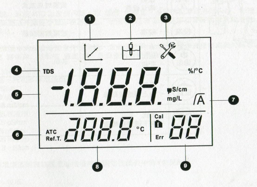 ④TDS因子設置或參數設置            ⑤電導率/TDS讀數或電極常數       ⑥自動溫度補償
